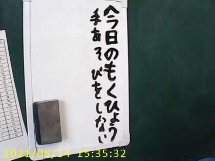 3年生HP記者「すてきなもくひょうを見つけたよ」 公開日 2021/05/14 更新日 2021/05/14 3年生 すてきなもくひょうを日直さんが考えてくれたよ。 もくひょうは、「手あそびをしない」だよ。 HP記者S・H