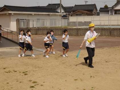 5月の避難訓練 公開日 2021/05/15 更新日 2021/05/15 お知らせ 今年度、全校で初めての避難訓練を行いました。給食室から出火したという想定、放送の指示をしっかりと聞き、火の手から遠ざかる経路で避難しました。1年生にとっては、小学校での初めての避難訓練で、広い校舎からグラウンドの端の避難場所までを一生懸命に移動しました。6年生の代表者からは、「お・は・し・も」を守って避難することができたと振り返りの発表がありました。