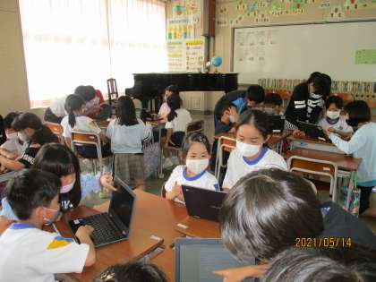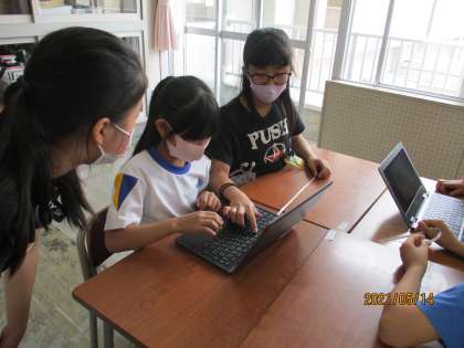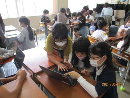 5年生さんに優しく教えてもらいながら、Chromebookの設定をしました。画面に絵を描いたり、写真を撮ったりして、使い方を勉強しました。5年生さんありがとう!