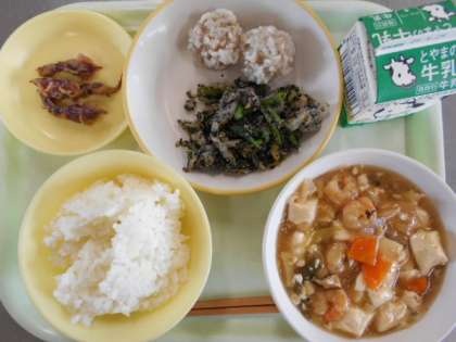 今日の献立は、ご飯、牛乳、チンズワンズ、よごし、海老と豆腐の旨煮です。明日の献立は、ご飯、牛乳、小鯵の唐揚げ、ひじきのマリネ、ポトフ、バナナです。