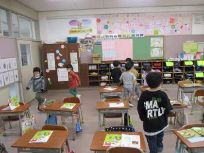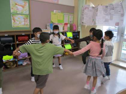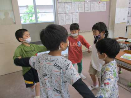 「ひらいたひらいた」の曲に合わせて遊んだり、「さんぽ」の曲に合わせて足踏みしたりしました。足踏みをしながら「拍」を感じ取ることができたようです。