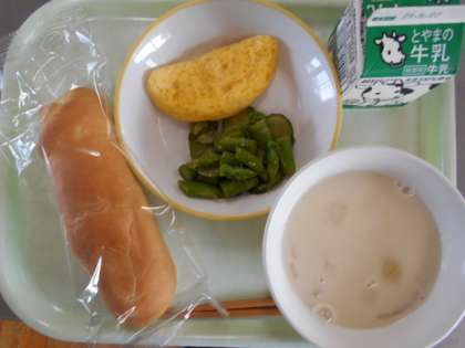 今日の献立は、米粉コッペパン、牛乳、オムレツ、グリーンサラダ、ビーンズポタージュです。明日の献立は、ビビンバ(焼き肉、ナムル、錦糸卵、ご飯)と牛乳、と味噌汁と冷凍ラフランスです。