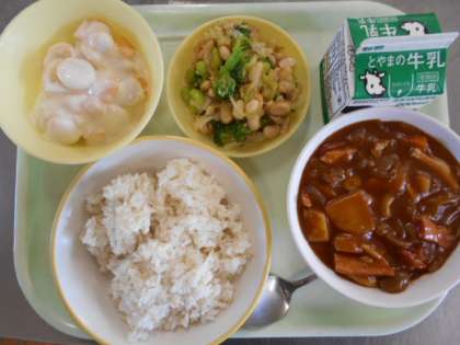 今日の献立は、食べキリンハヤシ(麦ご飯)、牛乳、豆豆サラダ、フルーツヨーグルトです。来週月曜日の献立は、ご飯、牛乳、魚の南蛮漬け、煎り大豆和え、関東炊きです。