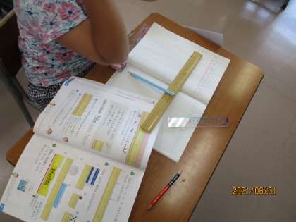 算数では、物の長さをどのように表すのかについて勉強しています。竹ものさしを使って、最近新しく習った「cm」と「mm」を上手に使いながら、問題を解いています。