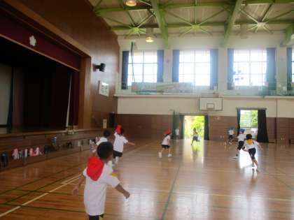 体育の時間に、体ほぐしの運動と投げる運動、走る運動をしました。