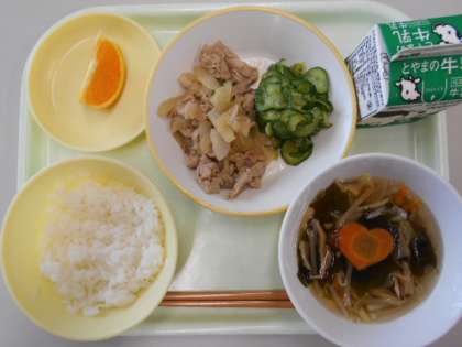 今日の献立は、ご飯、牛乳、豚肉の生姜焼き、きゅうりもみ、わかめスープ、バレンシアオレンジです。来週月曜日の給食は、ご飯、飲むヨーグルト、かにシューマイ、ブロッコリーサラダ、サッポロラーメン、しそかつおふりかけです。
