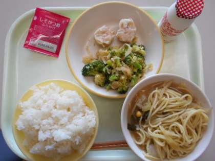 今日の献立は、ご飯、飲むヨーグルト、かにシューマイ、ブロッコリーサラダ、サッポロラーメン、しそかつおふりかけです。明日の献立は、ご飯、牛乳、かぼちゃ天ぷら、甘酢和え、八宝菜です。