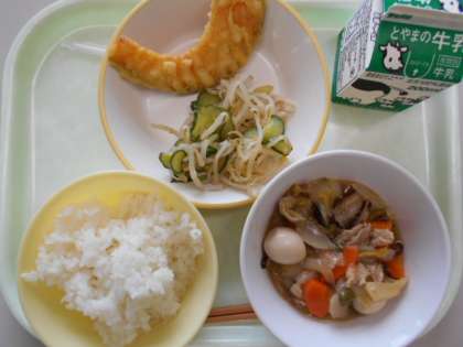 今日の献立は、ご飯、牛乳、かぼちゃ天ぷら、甘酢和え、八宝菜です。明日の献立は、ご飯、牛乳、大豆と帆立のごまからめ、昆布和え、卵とじです。