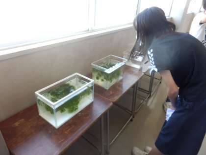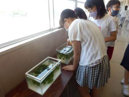 4時間目の理科の学習後です。メダカのオスとメスの話をしたのでしょう。終わりのあいさつをしたらすぐに、メダカの水槽の前に来て、「あ、これはメス!!」「こっちにオスおる。」と子供たち。オスとメスの違いを見分けていました。