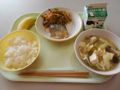 今日の献立は、ごはん、豆腐のみそ汁、さばのてりやき、くきわかめのきんぴら、バナナ、牛乳です。
