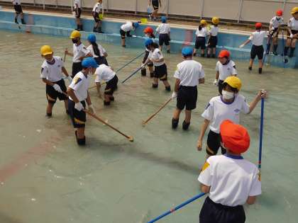 本日は、高学年がプール清掃を行いました。5年生がプール内の側面をたわしでこすり汚れを落としました。6年生はデッキブラシで床面を磨きました。思いのほか、排水に時間がかかり、来週改めてプール内をきれいにします。