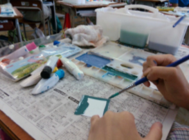 図工の時間で「心のもよう」を小さな紙に表しました。悲しいときや、うれしいとき、さみしいときを表しました。色や形を変えて、みんなステキな作品を作っていました。