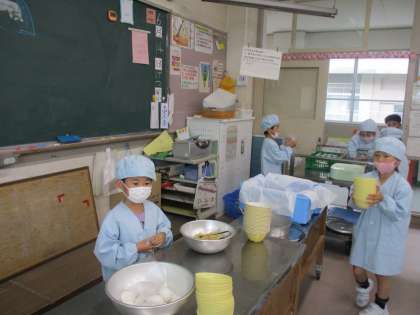 給食当番の仕事にも慣れ、友達と協力しながらてきぱきと準備しています。