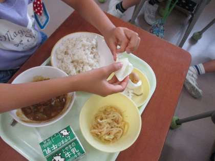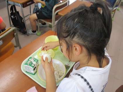 給食に初めて「ゆで卵」が出ました。殻をむくのが大変そうでしたが、上手にむいていました!