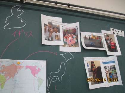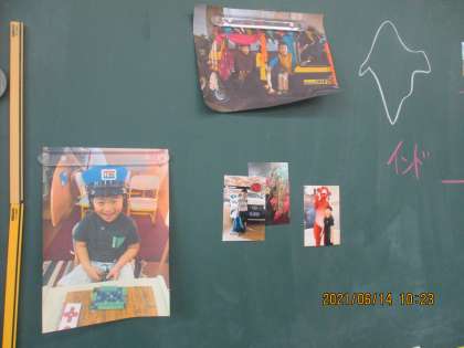 世界地図を見せながら、国名クイズを出しました。イギリスやインドで暮らしたことのある友達は、現地で撮った写真を見せながら、その国での生活について教えてくれました。食べ物や洋服、学校生活等、日本とは違う文化に触れて、みんな驚いていました。