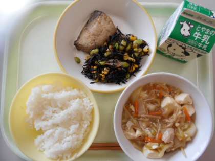 今日の献立は、ご飯、牛乳、ふくらぎの西京焼き、ひじきのソテー、豆腐の野菜あんかけです。来週月曜日の献立は、ご飯、牛乳、鶏肉の唐揚げ、よごし、冬瓜の吉野煮です。