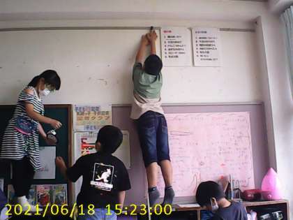 教室のたての長さ、よこの長さ、下からも上からもはかっている人がいました。