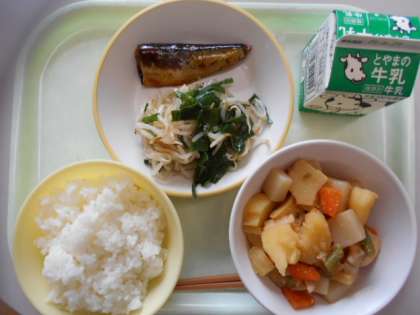 今日の献立は、ご飯、牛乳、鰯の梅煮、塩ナムル、鶏肉と野菜の旨煮です。明日の献立は、五目ご飯、牛乳、鰺フライ、刻み和え、ウチ豆汁です。