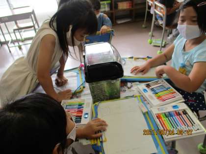 メダカチームでメダカをかんさつしました。メダカの下のぶぶんが光ってびっくりしました。いっぱいかんさつして、大きくそだったすがたがとてもたのしみです。