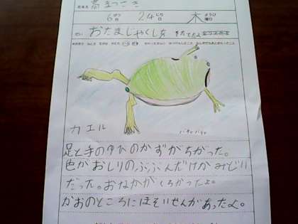 生きもののかんさつをしました。かえるの子はあまりおよげなくて、石のすきまにいました。あしと手のゆびの数がちがってびっくりしました。