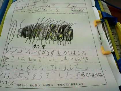 長さは1cmでした。元気がよさそうでした。そして、おいしそうにはっぱをたべていました。