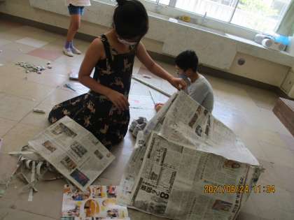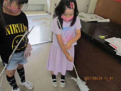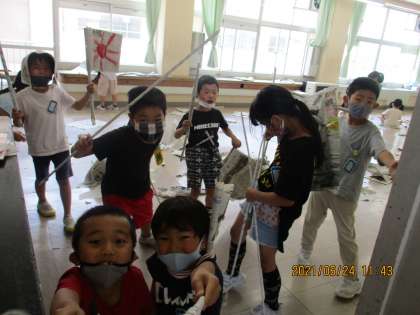 2年 新聞紙で遊ぼう 公開日 2021/06/24 更新日 2021/06/24 2年生 図工の時間に、新聞紙を使って様々な物を作りました。くるくる巻いたり、くしゃっと丸めたりして、剣や盾、家、ほうき等、たくさんのアイデアが出てきました。