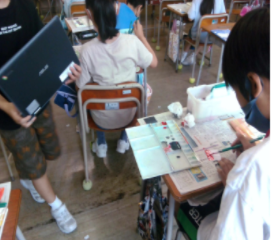 これは、図工の時間の様子です。気持ちを色や形にしてかく勉強です。みんな筆を使いこなしています。ティッシュでポンポンして気持ちを表現してる人もいました。次は、みんなでどんな気持ちか当てるクイズをする予定です。楽しみです。