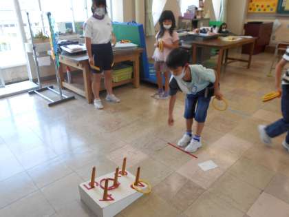 先週から始めた、ひまわり級の「あそびの広場」。第2弾は「輪投げ」です。声をかけたらすぐに何人もの低学年の子供が遊びにきました。入った点数に合わせて得点表も用意してわたしました。みんな一生懸命に投げ、見ている方も「がんばれ!」と応援しました。