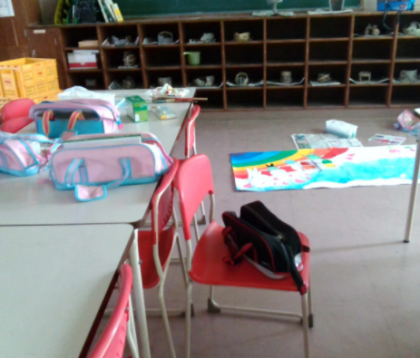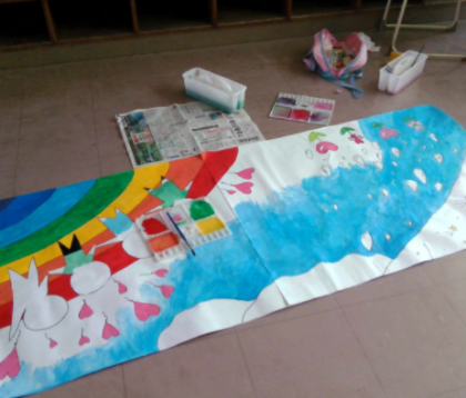 私達は、今学級目標を制作しています。みんなで、休み時間を使って絵の色を塗っています。目当ての文字は毛筆でかきます。完成するのが楽しみです。