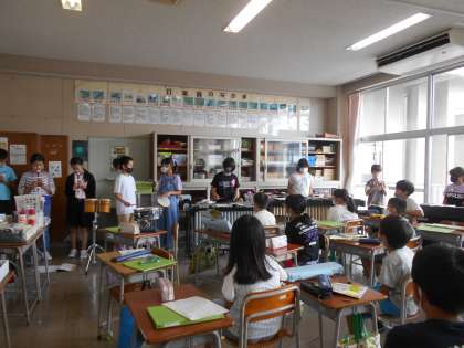 音楽では、グループごとにいろいろな楽器を選び、「リボンのおどり」を演奏しました。互いに聴き合い、音が重なり合うひびきを楽しみながら、友達の演奏のよさを見付けていました。