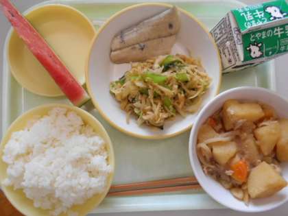 今日の献立は、ご飯、牛乳、鰆の塩焼き、はりはり和え、肉じゃが、スイカです。明日の献立は、ご飯、牛乳、人参シューマイ、ナムル、マーボー豆腐、冷凍りんごです。