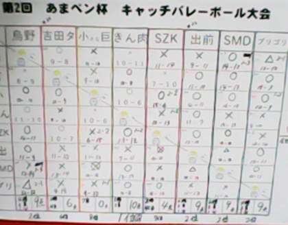 ビーチバレーの授業で、僕のチームは「烏野」というチーム名です。他にも7つのチームがあります。第2回あまペン杯で、僕のチームは最後に負けてしまい、2位でした。1位になれずとても悔しかったです。次は1位を目指したいです。