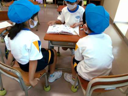 なぞなぞ係さんが休み時間に集まって、みんなに出題する問題を選んでいます。