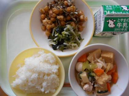今日の献立は、ご飯、牛乳、小魚入りフライビーンズ、酢の物、厚揚げの中華煮込みです。明日の献立は、ご飯、牛乳、鯖の銀紙焼き、ごま和え、冬瓜のそぼろあん、バナナです。