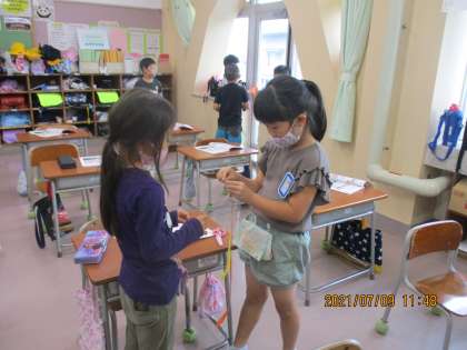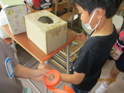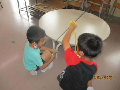 直接比較できない物の長さを比べるために、テープに長さを写しとって比べました。