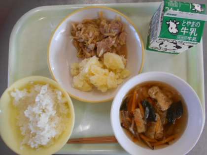 今日の献立は、ご飯、牛乳、あっさりチキン、粉ふき芋、沢煮椀です。来週月曜日の献立は、ご飯、牛乳、いわしの紀州煮、刻み和え、韓国風すき焼きです。