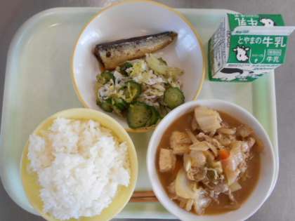 今日の献立は、ご飯、牛乳、鰯の紀州煮、刻み和え、韓国風すき焼きです。明日の献立は、ご飯、牛乳、高野豆腐とレバーのごまからめ、枝豆、ワンタンスープ、冷凍みかんです。