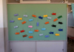 家庭科の時間に、裁縫で魚を作りました。自分で布の色を決めたり、糸の色を決めたりしました。中に綿を入れるところが1番楽しかったです。みんなの作品が完成しました。カラフルな魚がいっぱいです。