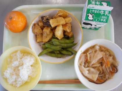 今日は1学期最後の給食です。献立は、ご飯、牛乳、高野豆腐とレバーのごまからめ、枝豆、ワンタンスープ、冷凍みかんです。皆さん味わって食べましたか?