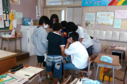 今日の3時間目に学活をしました。2時間目のあゆみ渡しの続きをしました。帰りの準備もします。あるグループでは、ひらがなが1番うまいのは誰かを競っていました。