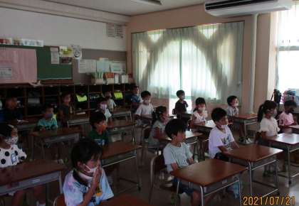 教室で先生方のお話を聞く子供たちの様子です。校歌を歌う様子をクロムブックの「クラスルーム」に貼り付けましたので、ぜひ視聴したり、校歌の練習に活用したりしてください。