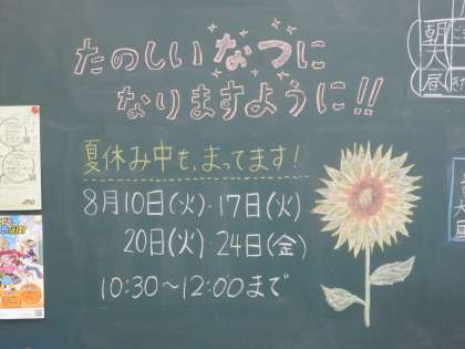 夏休み中も図書室開放日があります。借りた本を読み切ってしまったひとは、ぜひ来てくださいね。学校へきたら、職員玄関のインターホンを押してね。まっています。