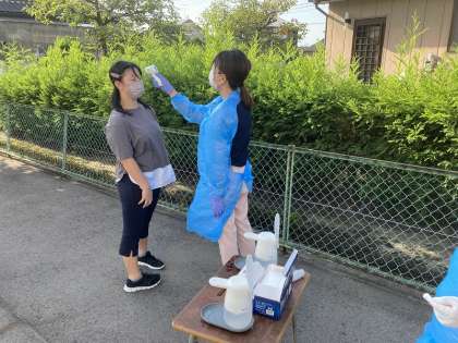 本日より2学期がスタートしました。各家庭で、健康チェックをしてきてもらった上で、児童玄関前でも、検温・消毒を行いました。