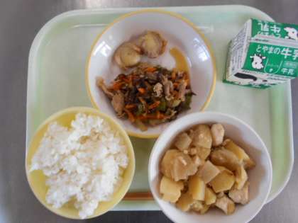 今日から2学期の給食が始まりました。今日の献立は、ご飯、牛乳、帆立の香味焼き、もずくのチャプチェ、ごまけんちんです。明日の献立は、ご飯、牛乳、鯖の銀紙焼き、はりはり和え、冬瓜の吉野煮、冷凍ミカンです。
