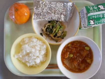今日の献立は、ご飯、牛乳、鯖の銀紙焼き、はりはり和え、冬瓜の吉野煮、冷凍ミカンです。明日の献立は、ご飯、飲むヨーグルト、わかさぎのフリッター、甘酢和え、高野豆腐の卵とじです。