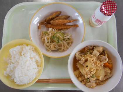 今日の献立は、ご飯、飲むヨーグルト、わかさぎのフリッター、甘酢和え、高野豆腐の卵とじです。明日の献立は、食パン、牛乳、チリコンカン、粉ふき芋、野菜スープ、棒チーズ、バナナです。