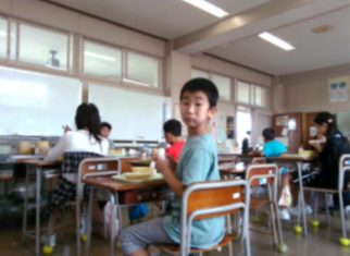 給食中の友達です。給食を美味しく食べています。友達は、給食が好きだそうです。今日の献立では、特にわかさぎのフリッターが美味しかったそうです。