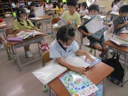 下の教科書を配りました。早速開いて、見入っている1年生。新しい学習が楽しみでたまらないようです!