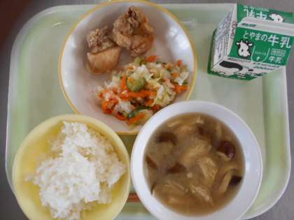 今日の献立は、ご飯、牛乳、鶏肉の米粉揚げ、コールスローサラダ、なすの味噌汁です。来週月曜日の給食は、ご飯、牛乳、厚焼き卵、海老ときのこのガーリックソテー、呉汁、穀物ふりかけです。