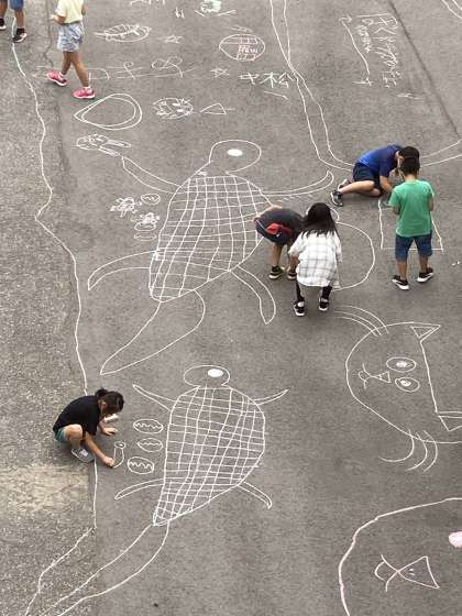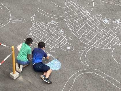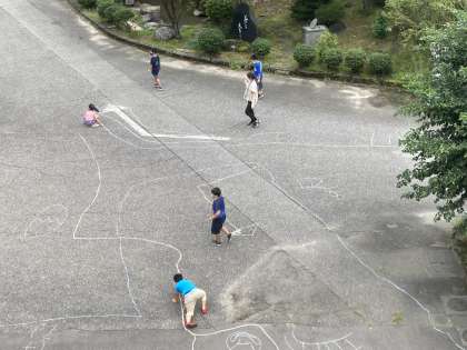 今日は、チョークを使い地面に思いっきり絵をかきました。